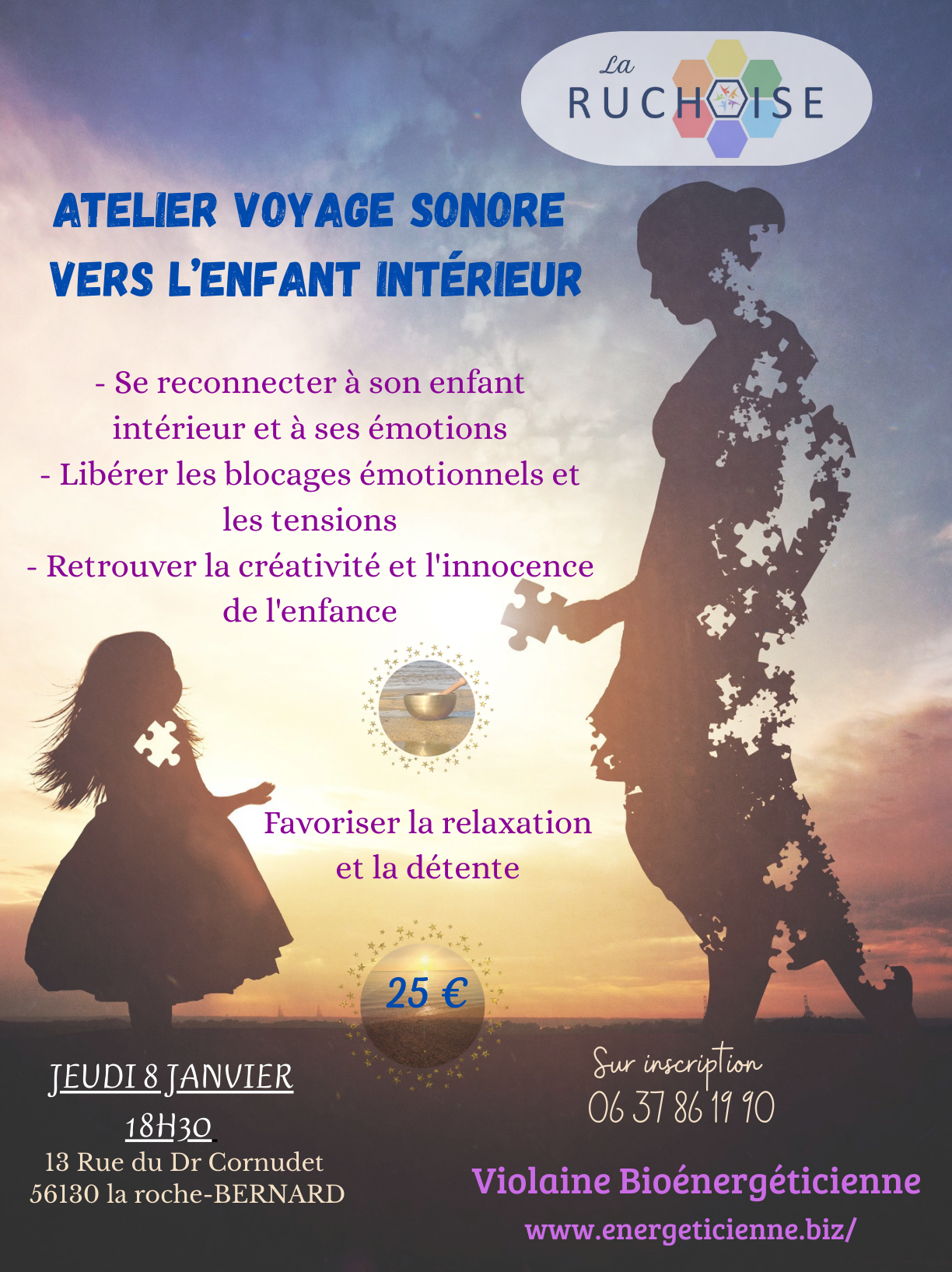 3. Exploration intérieure : Pendant le voyage sonore, vous serez invité à explorer votre monde intérieur et à rencontrer votre enfant intérieur, ce petit garçon ou cette petite fille que vous avez été. Vous pourrez lui parler, le câliner et le réconforter.